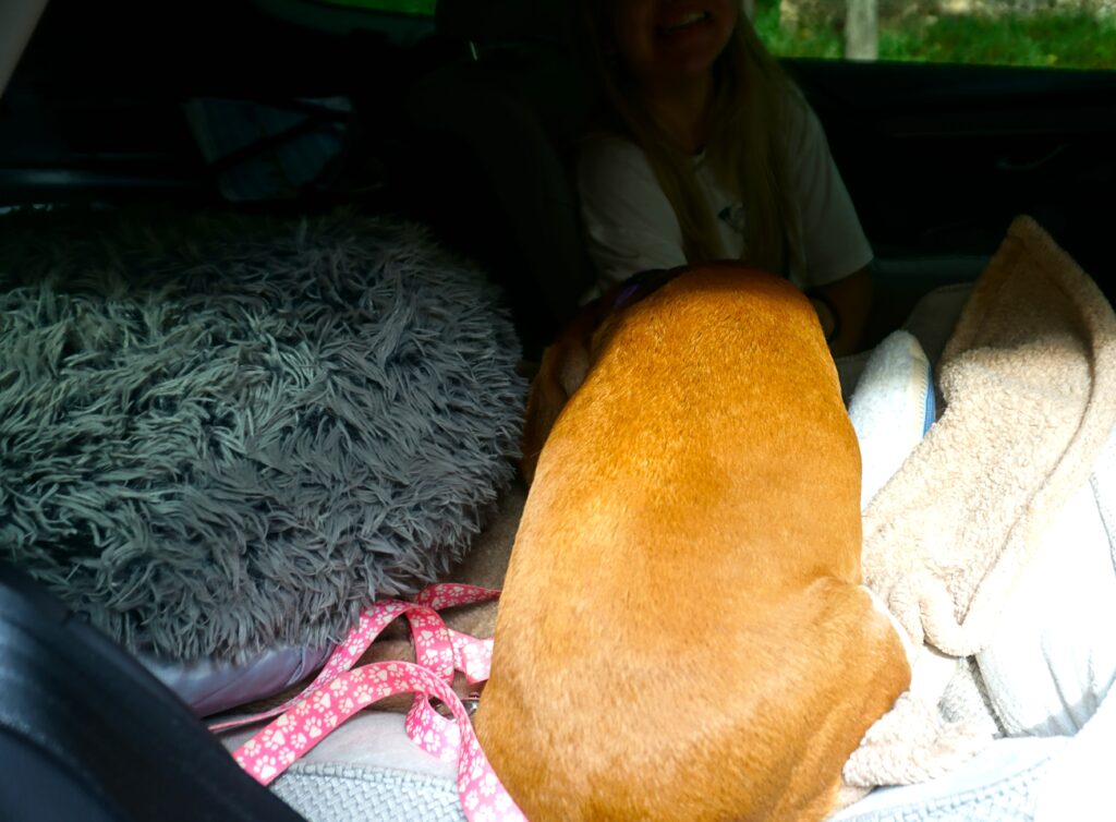 we sent along the dog bed she loved , and a leash and collar we got her used to before the trip. here our dogs don’t use um we have acreage they enjoy running around on .