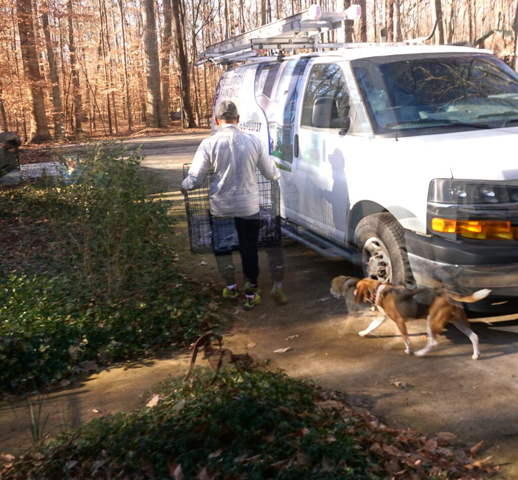 they asked if we had any contacts that might help them add another beagle to their pack. As it happens Miss C. had just shared all her puppy supplies with a neighbor who raises Coon Hounds after she could hear a litter of pups yipping thru the woods and figured he could use the shots, and food bowls ,beds, heating pads etc we no longer needed for his litter. He also happens to work for animal control, so she reached out and found out there was a young adult tri colored female they had just taken from an abandoned apt. He sent her picture to share and we had him bring her home, and over to our house to work with her to learn about her behavior and temp for their pack.