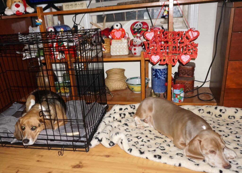 We love banjo already! And he and Jordy (other Sunshine beagle star) are getting along just fine. We gated off the kitchen and dining room as those floors are tile (not carpet). Banjo has been going outside and running like a nut on the grass (we fenced off a ‘smaller’ back yard so we can keep an eye on him) then he comes inside and curls up to sleep in his crate (door open)!