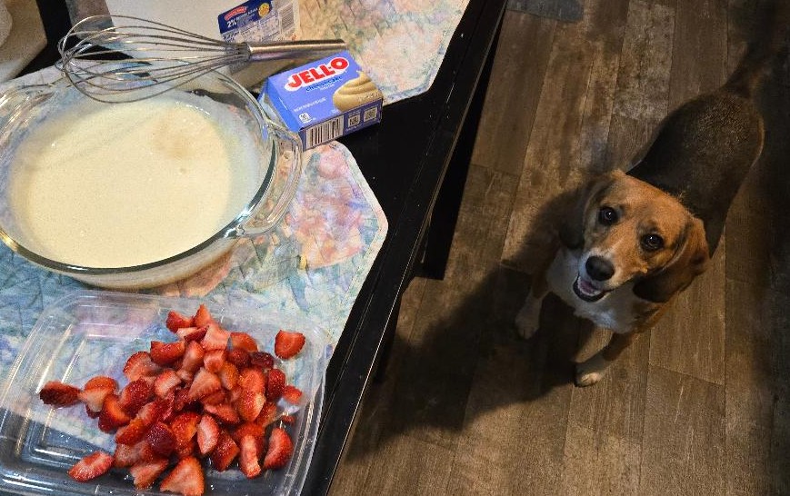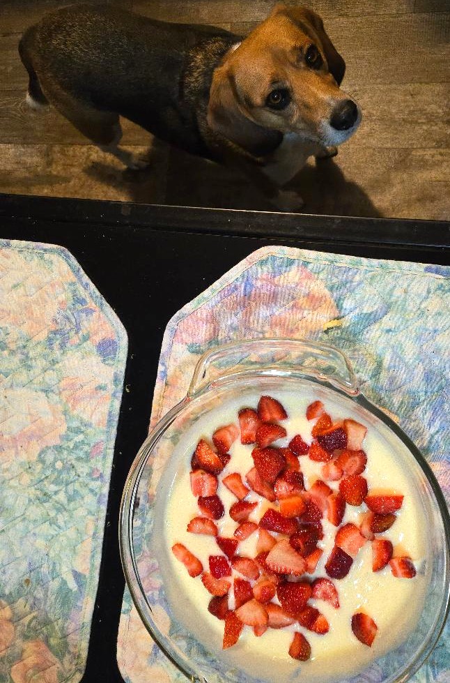 then he watches as Miss C. makes desert…. Cheese Cake Pudding and Strawberries ontop !
