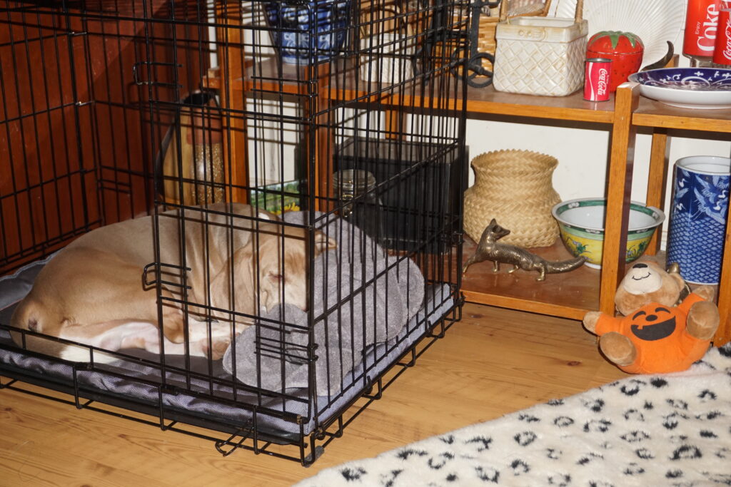 our khaki boy Happy likes to go into the crate when he visits us , so the pair take turns