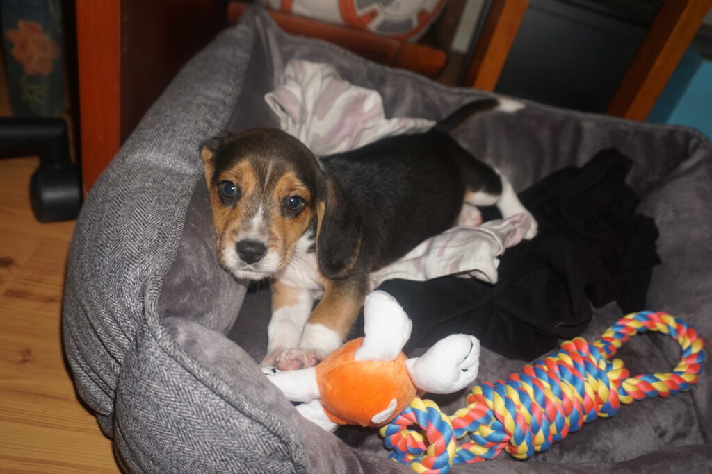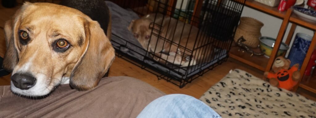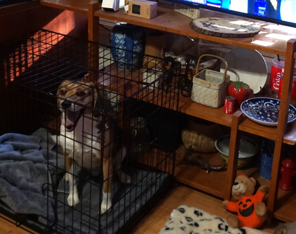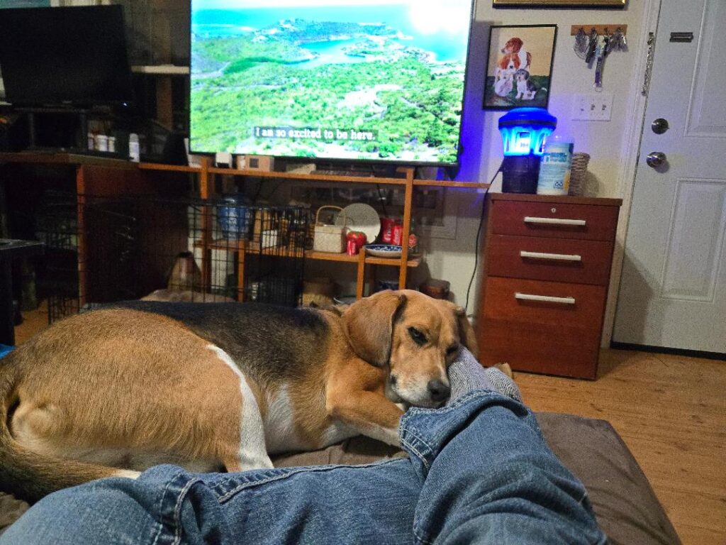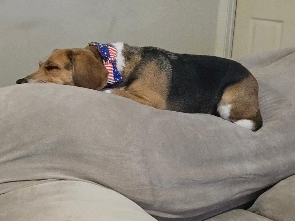 We love banjo already! And he and Jordy (other Sunshine beagle star) are getting along just fine. We gated off the kitchen and dining room as those floors are tile (not carpet). Banjo has been going outside and running like a nut on the grass (we fenced off a ‘smaller’ back yard so we can keep an eye on him) then he comes inside and curls up to sleep in his crate (door open)!
