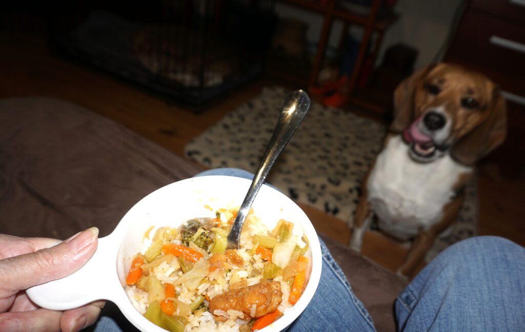 he watches intently as Miss C. has some rice, orange chicken and veggies …